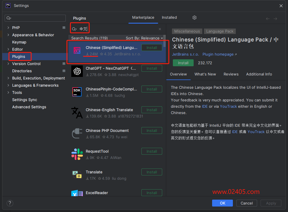 PhpStorm 设置中文方法 0 By 董德多 on 2023年11月23日 Windows 一、打开 PhpStorm 软件,然后点击File–Settings按钮或者直接按下Ctrl+Alt+S组合键,打开Settings窗口。 二、在Settings窗口左侧的菜单中,选择Plugins,然后在右侧的搜索栏中输入“中文”,搜索插件。 三、选择“Chinese(Simplified) Language Pack / 中文语言包”(PS:下载次数最多那个),然后点击install安装,安装完安成后重启 PhpStorm ,汉化完成。 phpstorm