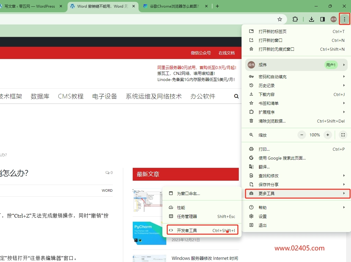 1.首先打开 Chrome 浏览器,点击【自定义及控制Google Chrome】图标(浏览器右上角的三个竖点),选择【更多工具】,再点击【开发者工具】。