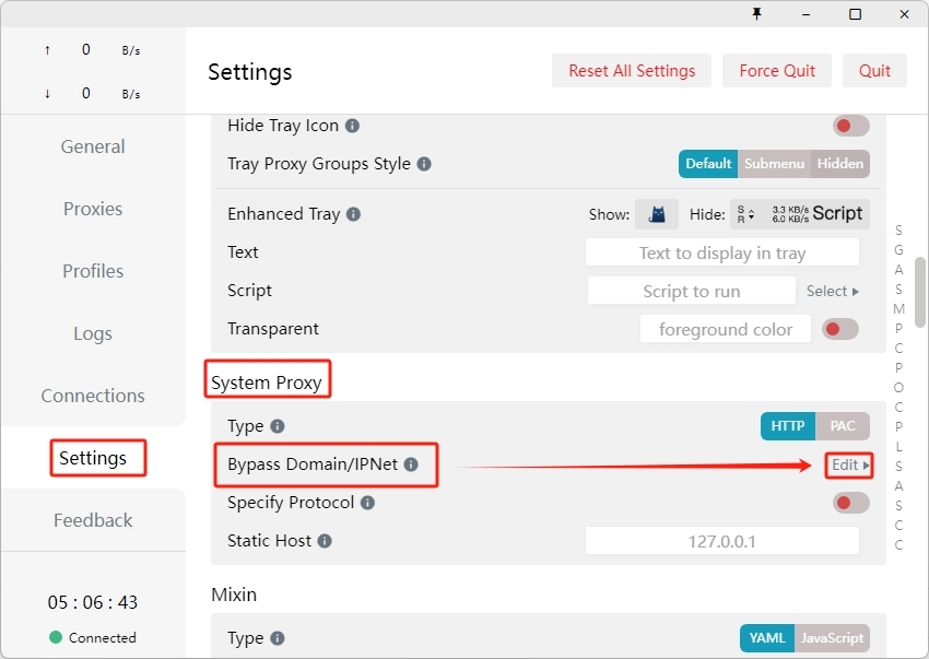 此时我们可以指定网站在运行 Clash for Windows 时不走代理,只需要在 setting->system proxy 里,找到 bypass(代理绕过设置),把需要绕过的网址写进去就可以了。