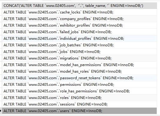 执行后,就会批量将数据表改为 InnoDB 引擎了。