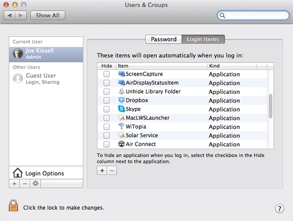项目通常最终出现在此列表中,因为应用程序将它们添加到其中。大多数这样做的应用程序首先会要求您获得许可,或者在其设置中具有“登录时打开”或类似复选框。在任何情况下,您都可以通过单击 (+) 按钮手动将项目添加到列表中,或者通过选择项目并单击减号 (-) 按钮来删除项目。