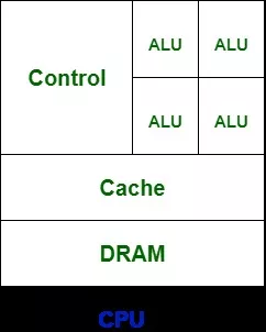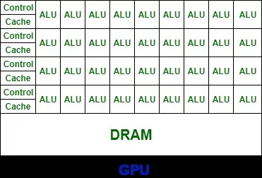 GPU通常用于在计算机游戏中提供图像处理能力。 GPU的速度比CPU的速度快,并且它强调高吞吐量。它通常与电子设备集成在一起,以便与电子设备共享RAM,这非常适合执行最重要的计算任务。GPU包含的ALU单元多于CPU。GPU的架构图示如下: