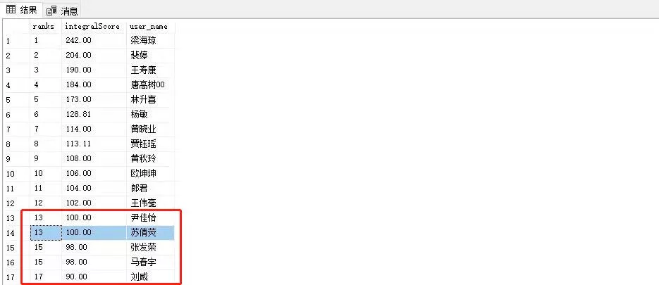 针对上述情况可以使用dense_rank函数来解决,这样排名需要就会连续出现。
