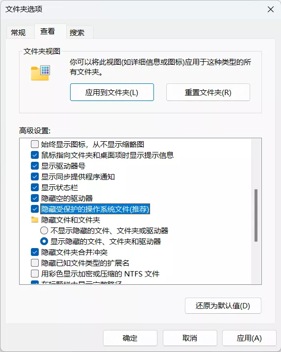 3、文件夹选项中,要勾选“隐藏受保护的操作系统文件(推荐)”,否则文件夹也不会被隐藏。当然,有的时候忘记隐藏了什么,可以用这种方式显现回来;