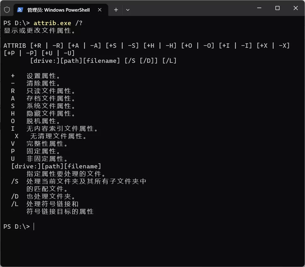 | /l | 将 attrib 和任何命令行选项应用于符号链接,而不是符号链接的目标。 |