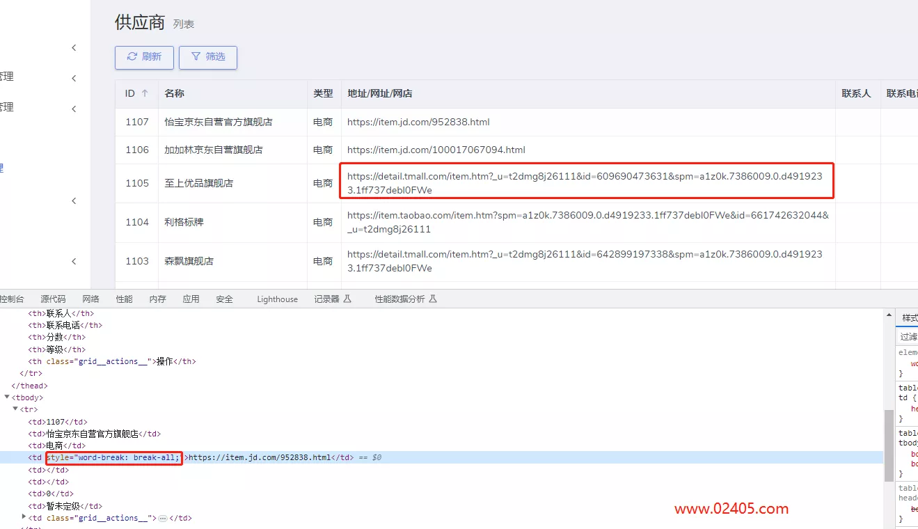 恰好我个列超长的就是英文网址,因此我们需要修改一下 td 的换行样式,改为:word-break: break-all 就可以了。