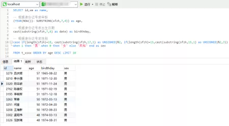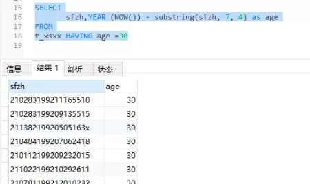 根据身份证号查询年龄大于等于65岁的数据: 根据身份证号查询年龄等于30岁的数据…
